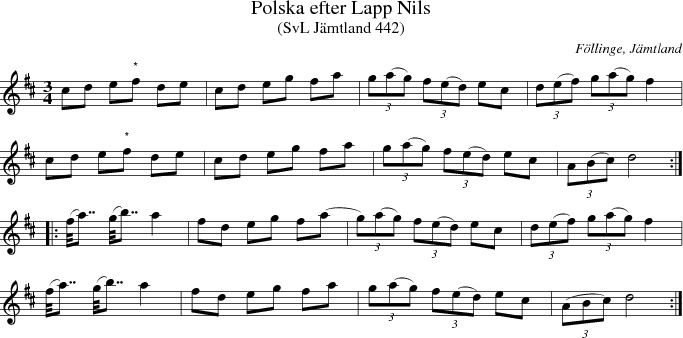 | Anteckningar | Toner med * indikerar en ton mellan f och fiss. SvL: Polskan spelades på olika sätt, men enligt Pål Nilssons utsago var hans tolkning av densamma den riktiga och den som kom närmast Lapp Nils spel. SvL: Jmf Munter Johans version (SvL J. 186), som även han hade dirket från Lapp Nils. Se även Nikolausson nr. 106. Spelbar på säckpipa i A |