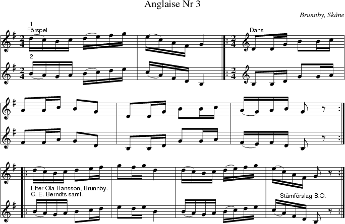 | Abc-uppteckning | Bengt Ohlson "Gamla Dansar i Skåne. Anglaise (3)" "Efter Ola Hansson, Brunnby. C. E. Berndts saml." |
